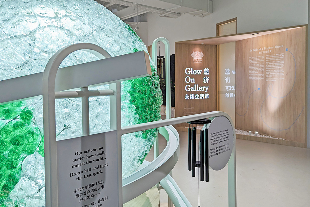 The Glow On Gallery is a permanent exhibition gallery covering an area of 336m2. The exhibition content is based on a sustainable development framework, sharing how Tzu Chi, a non-governmental organization, implements sustainability in daily life.