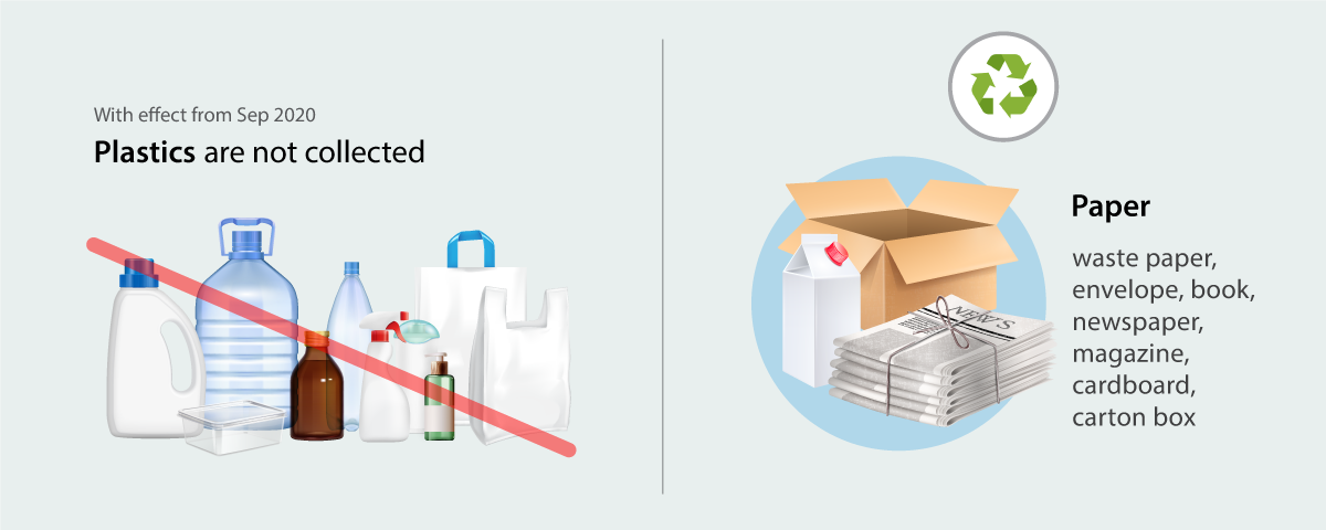 - Paper: waste paper, envelope, book, newspaper, magazine, cardboard, carton box