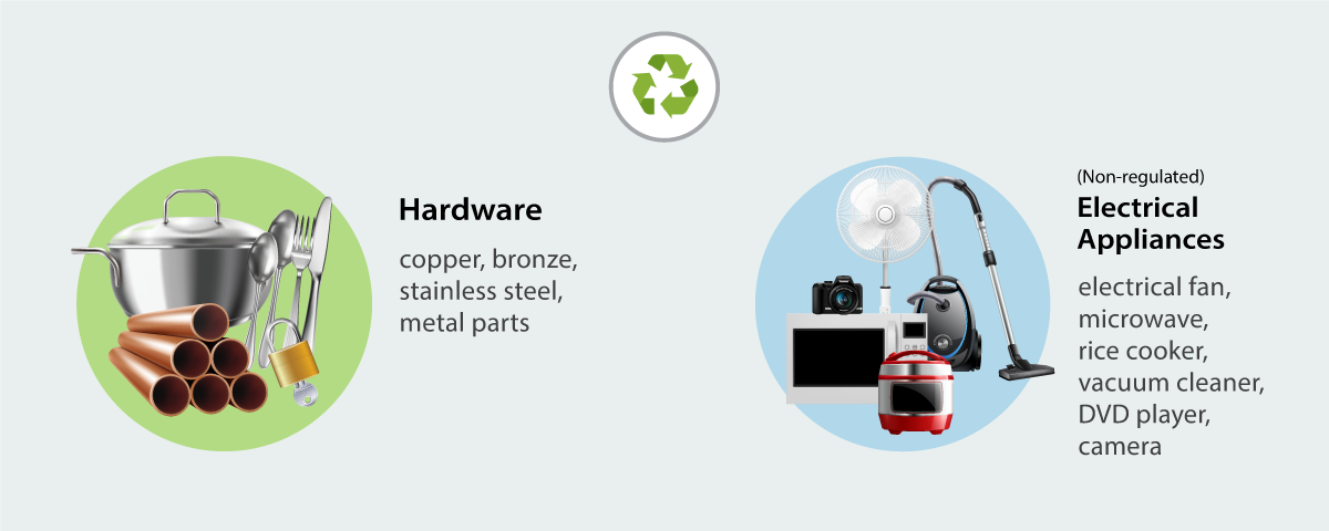 - Electrical appliances (Non-regulated items): electrical fan, rice cooker, DVD player, microwave, camera, vacuum cleaner, soundbar, blender